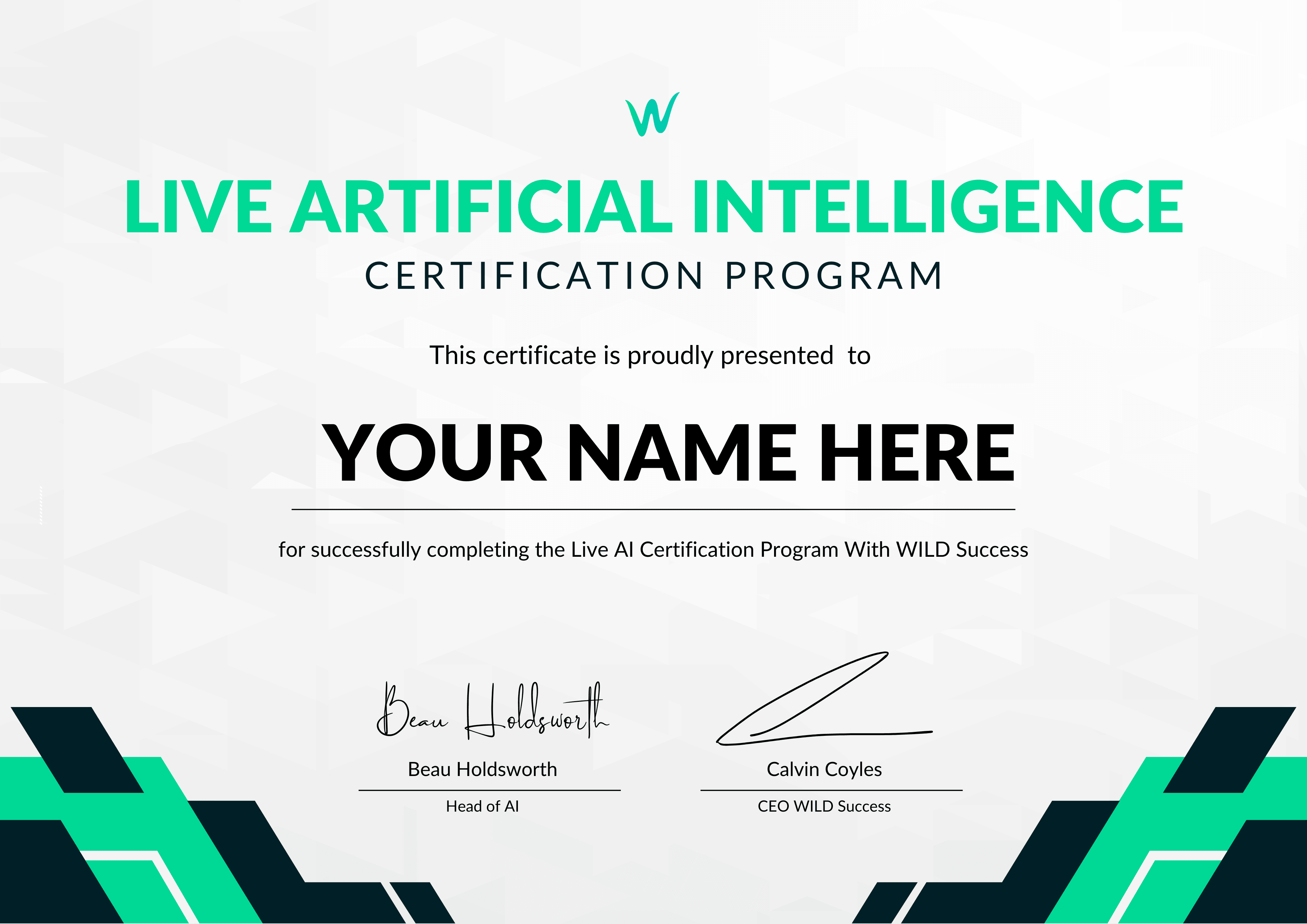 You will receive a certificate of completion that recognises your foundational understanding of AI concepts within the Wild Success ecosystem.